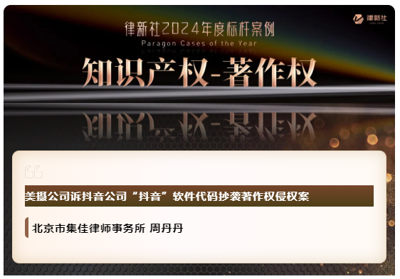 球探体育即时比分比分凭借在知识产权保护领域卓越的专业实力与良好的行业口碑,入选《律所卓越品牌影响力指南(2024)》,荣获“律新社2024年度精品品牌律所30佳”奖项;同时,集佳周丹丹律师代理的“美摄公司诉抖音公司'抖音'软件代码抄袭著作权侵权案”获评“律新社2024年度标杆案例:知识产权-著作权领域”。