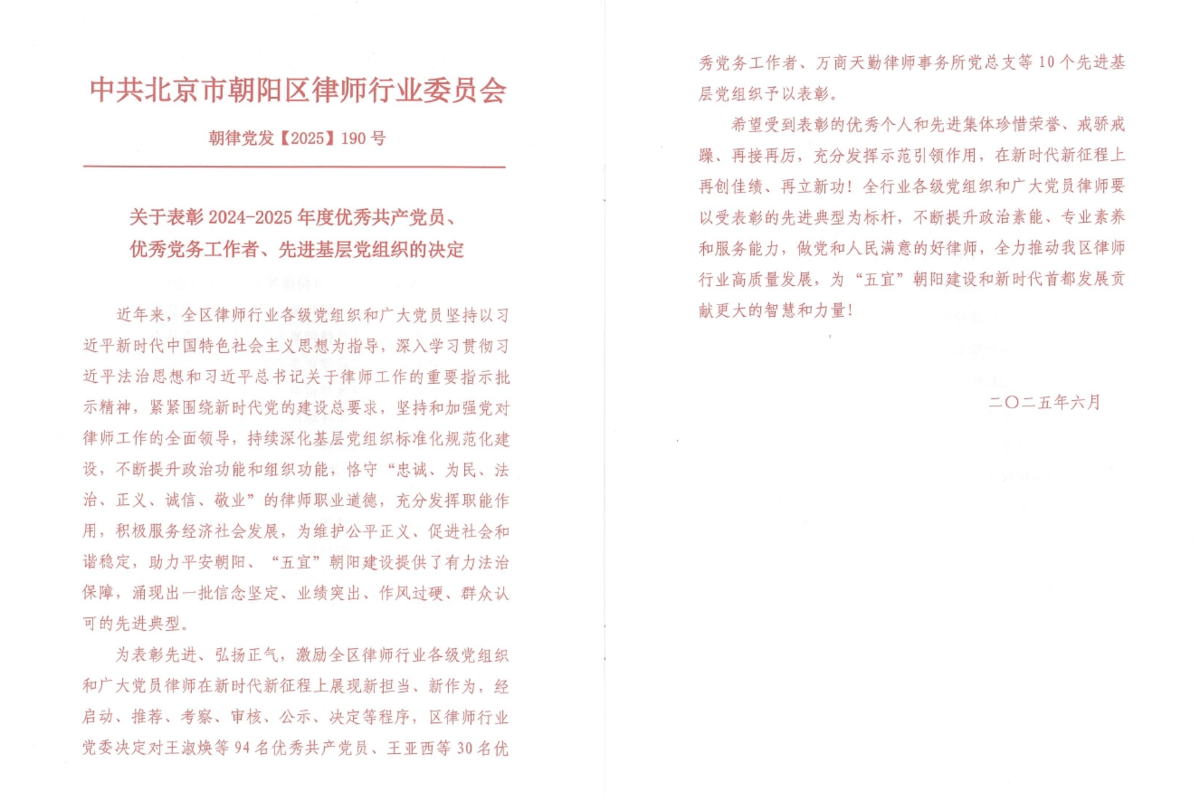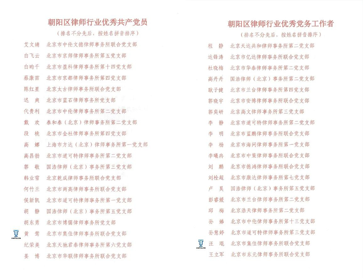 6月27日,朝阳区律师行业党委召开了朝阳区律师行业庆祝中国共产党成立104周年暨总结表彰大会,球探体育即时比分比分联合党支部党员黄莺荣获“朝阳区律师行业优秀共产党员”称号,支部党员汪琨荣获“朝阳区律师行业优秀党务工作者”称号。
